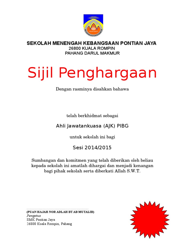 Boleh gunakan sebagai tanda menghargai murid-murid aktif PdPR meraikan sumbangan ahli jawatankuasa AJK penghargaan sumbangan atau komitmen penceramah dan lain-lain lagi. Sains c44 unit patologi hospital dungun. SEKOLAH MENENGAH KEBANGSAAN PONTIAN JAYA 26800 KUALA ROMPIN PAHANG DARUL MAKMUR Sijil Penghargaan Dengan rasminya disahkan bahawa telah berkhidmat sebagai Ahli Jawatankuasa AJK PIBG untuk sekolah ini bagi Sesi 20142015 Sumbangan dan komitmen yang telah diberikan oleh beliau kepada sekolah ini amatlah dihargai dan menjadi kenangan bagi.